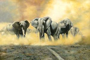 Unbekannter Künstler, 'Elefantenherde', Öl auf Leinwand, gerahmt. 60x90 cm (Maße ohne Rahmen). JH Transport kann diese Ware zu JHs Lagern in Odense oder Ishøj, Dänemark, für DKK 300 + dänische MwSt., oder zu dänischen Inlandspreisen zu jeder Adresse in Dänemark transportieren.