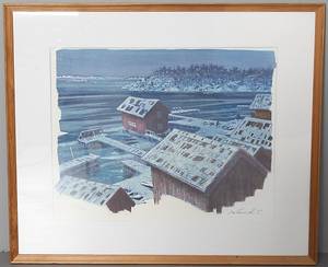 ROLAND SVENSSON (1910-2003): "Vinterskymning, Sandhamn", 1977, signerad roland S, 298/360, färglitografi, bildmått ca 33x43 cm. 788621. Läs mer...