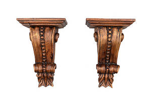 Paarige Wandkonsolen, wohl Eiche, lasiert. Maße ca. 34 x 23 x 15 cm.