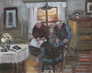 Sällskap i interiör, "Vekerum", "Amanda fyller, händelse 1943", ca 32 x 38 cm Läs mer...