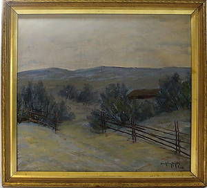 JOHAN HILDING HÄGLEBY (1900-1981): Vinterlandskap, signerad och daterad Johan Hilding 1934, olja på pannå, ca 28x39 cm. Gulnad fernissa. Läs mer...