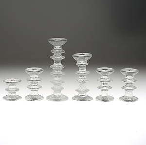 Timo Sarpaneva 1926-2006 Fem ljusstakar i olika storlekar tillverkade av klart glas Formgivna av Timo Sarpaneva för Iittala Signerade: TS Tre stycken har klisteretikett: I Läs mer...