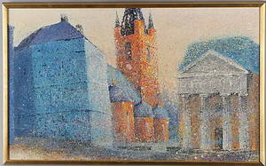 Avslutade auktioner liknande LARS ERIK LINDELL. Stadsmotiv med kyrka, olja på pannå, signerad.