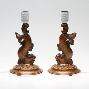 Avslutade auktioner liknande OIDENTIFIERAD KONSTNÄR. Bordslampor i form av delfiner, ett par, trä. Signerade E.T. och daterade 90.