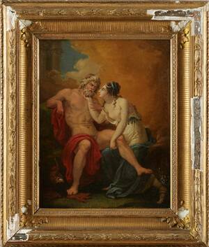 OIDENTIFIERAD KONSTNÄR (1800-tal): Mytologiskt motiv av Zeus med gudinna, oidentifierad konstnär, uppfodrad, 49x37 cm. Färgbortfall.