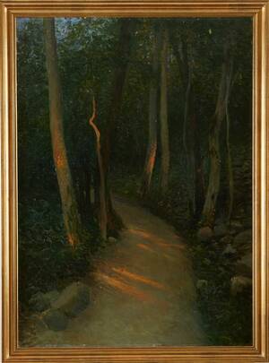 JOHN KINDBORG (1861-1907): Kvinna i skog, signerad och daterad Johan Kindborg 83, olja på duk, ca 31 x 23 cm. Krackelyr. Läs mer...