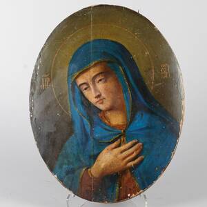 IKON, Ryssland, Maria 1800/1900-tal, målad på oval träpannå, största mått ca 39 x 36 cm. Konvex, färgbortfall, krackelyrer, bruks- och åldersrelaterat slitage.
