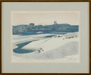 ROLAND SVENSSON (1910-2003): "Kallt", 1975, signerad Roland S., 1:sta provtryck utan korrektion, färglitografi, bildmått ca 29 x 41 cm. Med dedikation.