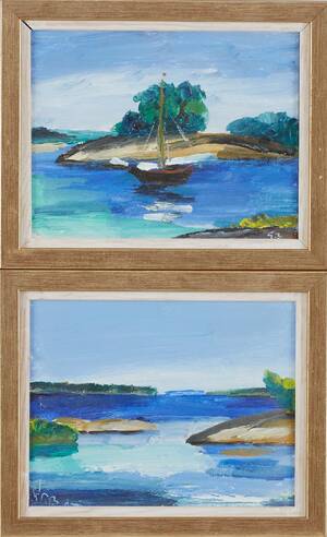 GÖRAN BRUNIUS (1911-2006): (2) Segelbåt samt klippor, monogramsignerad GB, olja på duk, ca 18x23 cm vardera . 355076.