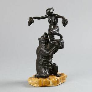 JOSEPH URBANIA, 1900-talets början, signerad J. Urbania, patinerad brons, kvinnofigur med druvor uppbärandes av björn, på stensockel, total höjd 29 cm. 386866.
