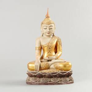 SKULPTUR, 1900-talets andra hälft, sittande buddha, snidat, förgyllt och bemålat trä, höjd 56 cm. 390871.