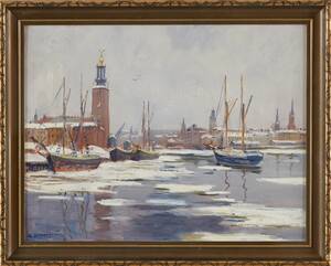 Gunnar Zetterström (1902-1965), Sverige. Vy mot Skeppsholmen. Signerad. Olja på pannå, 30x38, yttermått inklusive ram: 40x50 cm. Gunnar Zetterström, född 1902 i Stockholm, död 1965, Läs mer...