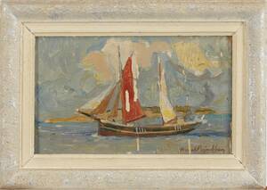 HARALD LINDBERG (1904-1976): Röda seglet, signerad Harald Lindberg, olja på pannå, ca 19x32 cm. Färgbortfall.