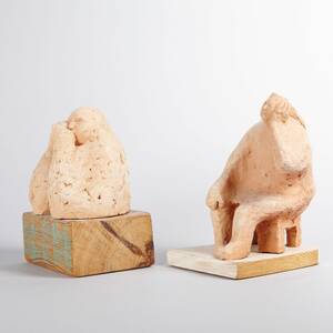 BIGBRITT ALMSTRÖM (född 1928): (2), skulpturer "Filosoferande", lergods, på träsockel, signerade Big Almström samt daterade 1988, höjd ca 25 cm. 393746.