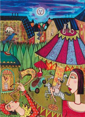 ANGELICA WIIK (född 1960): Karusell, signerad Angelica Wiik, färglitografi med glitter, EA, ca 59x43 cm, oramad. 399698.