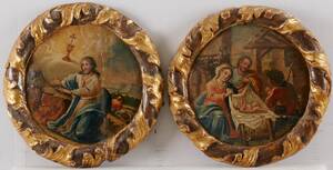 OIDENTIFIERAD KONSTNÄR (1800-tal): Religiöst motiv, 1 par, olja på pannå, ram i förgyllt pastellage, tondo, diameter ca 33 cm. Skador, retuscher, maskstungen.