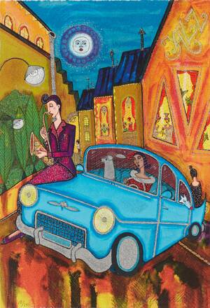 ANGELICA WIIK (född 1960), "Månjazz", signerad Angelica Wiik, 12/290, färglitografi med glitter, ca 30x43,5 cm, oramad. 399705.