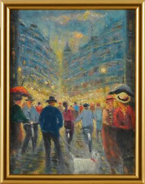 BENGT FRANSSON (född 1935): "Flanörer i staden", signerad Bengt Fransson, olja på duk, 35x27 cm . 413457.