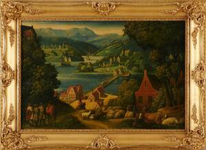 OIDENTIFIERAD KONSTNÄR (1800-tal): Flamländskt landskap, osignerad, olja på pannå, 59x90 cm. Sprickor.