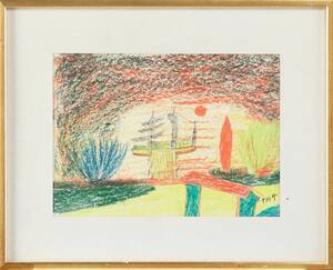 PRIMUS MORTIMER PETTERSSON (1895-1975), komposition med skepp, monogramsignerad, blandteknik (krita och blyerts), ca 20 x 28 cm. 422411.