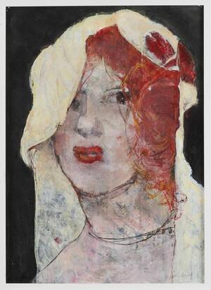 KJELL ÅSLUND (född 1948): Damporträtt, signerad a tergo Kjell Åslund 2005, blandteknik på pannå, 61x44 cm. 422637.