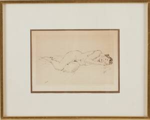 AXEL FRIDELL (1894-1935): Liggande modell, signerad med blyerts Fridell, signerad i plåten A Fridell, torrnål, ca 19x28,5 cm. 432747.
