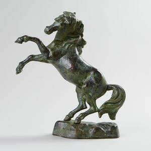 SKULPTUR, brons, 1900-talets första hälft, i form av stegrande häst, höjd ca 34 cm. Foten borrad efter tidigare montering .