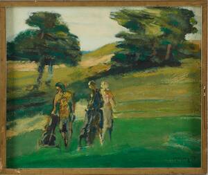 IVAR MORSING (1919-2009): " På golfbanan", signerad och daterad Morsing 73, olja på pannå, ca 37x44 cm. 434010.