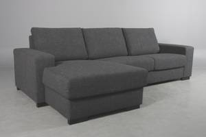 Moderne 3 pers. sofa med chaiselong i venstre side. Stående på mørke træben. Komposition: Fast sæde med 35kg 160 neuton på nozakfjedre, hynder med granulat og fibervat. Polstret med kraftigt møbelstof i mørke grå. L. 269cm, H.83cm, D.92/155cm. Fremstillet i EU.
