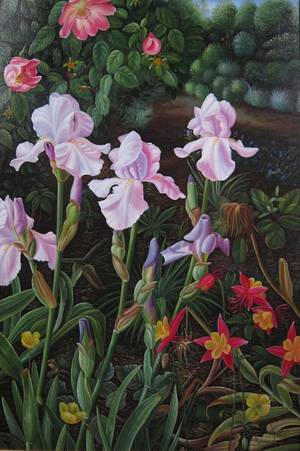 Unbekannter Künstler, 'Blumenwiese mit Lilien, Öl auf Leinwand, gerahmt, 90 x 60cm (Bildmaß ohne Rahmen). JH Transport kann diese Ware zu JHs Lagern in Odense oder Ishøj, Dänemark, für DKK 375, oder zu dänischen Inlandspreisen zu jeder Adresse in Dänemark transportieren.