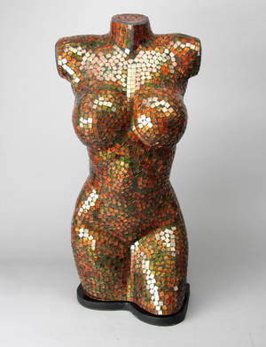 Skulptur i form af kvinde torso af glasfiber beklædt med ca 1 cm2 store stykker spejlglasmosaik. Står på sokkel af sortmalet træ. Højde 62 cm. Läs mer...