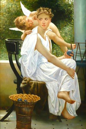 Unbekannter Künstler, 'Venus und Amor', Öl auf Leinwand, Holzrahmen, stuckiert und goldfarben gefasst, 89x59 cm (Maße ohne Rahmen). JH Transport kann diese Ware zu JHs Lagern in Odense oder Ishøj, Dänemark, für DKK 375, oder zu dänischen Inlandspreisen zu jeder Adresse in Dänemark transportieren.