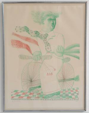 Alexandre Fassianos, Man med cykel. färgetsning signerad och numrerad 48/70. Bladmått ca 57 x 66 cm. Ej examinerad ur ram. Läs mer...