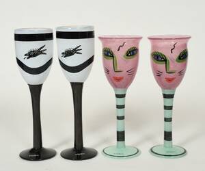 + vinglas, 3 + 2 st, Ulrica Hydman-Vallien (1938-2018), Sverige. Kosta Boda. Höjd: 25 cm. Ulrica Hydman-Vallien, svensk konstnär född 1938, död 2018. Läs mer...