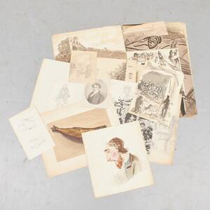 TECKNINGAR, akvareller, tryck och etsningar, tot 24 st, bl a Karl Johan Gullberg (1884-1951), bildytorna mellan ca 17x19 och 31x40 cm. Fläckar, gulnader, slitage, revor. Läs mer...