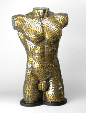 Mande torso i mosaik med lys. Skulptur i glasfiber beklædt med ca 1 cm2 store stykker multifarvet glasmosaik. Står på sokkel i sortmalet træ med Läs mer...