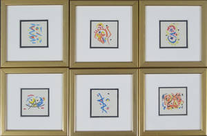 Egill Jacobsen. 6 farvelitografier. Kompositioner, Vignetter til digtsamling af Ole Sarvig. Usign. Trykt af Hans Jørgen Brøndum i 1982. 7 x 7 (18 x 18). (6)