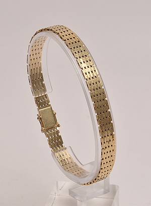 Murstens armbånd af 14 kt guld Armbånd af 14 kt guld i mursten-blockmønster med kasselås og dobbelt sikkerhedshasper . L. 18,5 cm, B. 9,2 mm. Läs mer...
