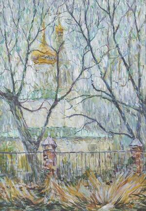 Oidentifierad Konstnär, Ryssland, Träd och Kyrka, signerad och daterad 1977. 58x39 cm.