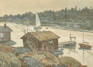 Roland Svensson (1910-2003), Sverige. Från storskärgårn. Signerad, färglitografi, numrerad 180/250. Bildmått: 24x20 cm, yttermått inklusive ram: 42x36 cm. Roland Svensson, född 1910 i Stockholm, död Läs mer...
