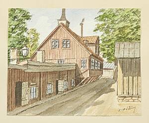 Frans Lindström (1874-1954), Sverige. Signerad, hus. Akvarell, bildmått: 13xx23cm, yttermått inklusive ram: 28x35cm. Frans Lindström, född 1874 i Stockholm , död 1954, svensk målare. Läs mer...