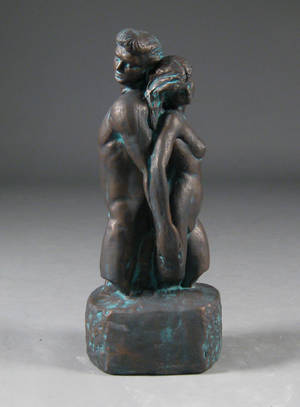 Skulptur af frostsikret, bronzeret stenmateriale i form af kvinde og mand. H. 60 cm. 40 kg. Obs: skal læsses på egen hånd.