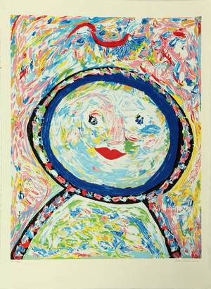 Jørgen Nash. 'Slikmutter'. Farvelitografi. Sign. Jørgen Nash 2002, EA . 21/31. Uindrammet. Bladstr. 107x79 cm. Lille revne i yderste venstre side af papiret Hidrørende fra Jørgen Nash og Lis Zwicks kunstsamling på Drakabygget. 'Jørgen Nash debuterede som billedhugger, men har siden udstillet som maler. Hans mest egenartede materiale er medierne, og hans fornemste værk i denne genre er uden tvivl historien om mordet på Den lille Havfrue, der bragte ham og den hovedløse havfrue på alverdens forsider i 1966, to år efter den egentlige begivenhed. Medierne var også del af materialet i de happenings, han ofte udførte sammen med Jens Jørgen Thorsen. I skrift og handling har N. en lang karriere inden for kritik af det etablerede, fastlagte og forudsigelige, hvilket bl.a. Det kgl. Teater og Det Danske Akademi opdagede, da de blev udsat for happenings i starten af 1970erne. I de senere år har protesterne mere været i skriftlig form. I 1960 grundlagde N. sammen med sin bror Asger Jorn Bauhaus