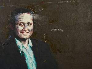 Mirko Vucinic (f. 1957), signerad, 2002 Stan Getz duk, 60x80. Mirko Vucinic, serbisk bildkonstnär född i Sid nära den Kroatiska gränsen i dåvarande Jugoslavien 1957.