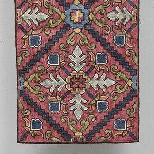 Mörkbrun botten med polykromt broderat mönster fåglar, kransar och häst. Slitage, revor lagningar, i fylld datering. Läs mer...