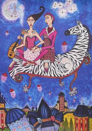 Angelica Wiik (f. 1960), Sverige. Kvinna med zebra, ställvis med glitter. Signerad, färglitografi, numrerad 271/290. Bladets mått: 44x3, yttermått inklusive ram: 58x43 cm. Angelica Wiik, Läs mer...