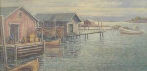 Oidentifierad konstnär. Signerad, fiskeläge. Olja på duk, 34x68cm.