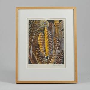 Maria Hillfon (f. 1945), Sverige. Fjädrar. Signerad, numrerad 57/250. Färglitografi, bildmått: 32x39 cm, yttermått inklusive ram: 51x56 cm. Maria Hillfon, svensk målare, grafiker och textilkonstnär Läs mer...
