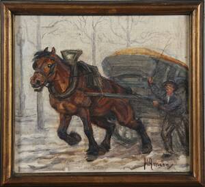 Hästar & hundar i stallet. Till synes osignerad. A tergo, proveniens: Hjelmstierna Stämplad. Ej examinerad ur ram. Mått bildyta: 16,5 x 11,5 cm Konditionsrapport: Slitage Läs mer...
