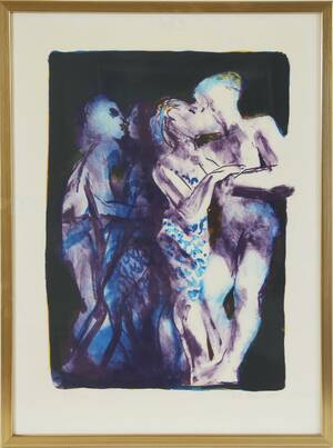 Färglitografi, figurkomposition. Signerad och daterad 85. Numrerad. Inramad. (53x38)